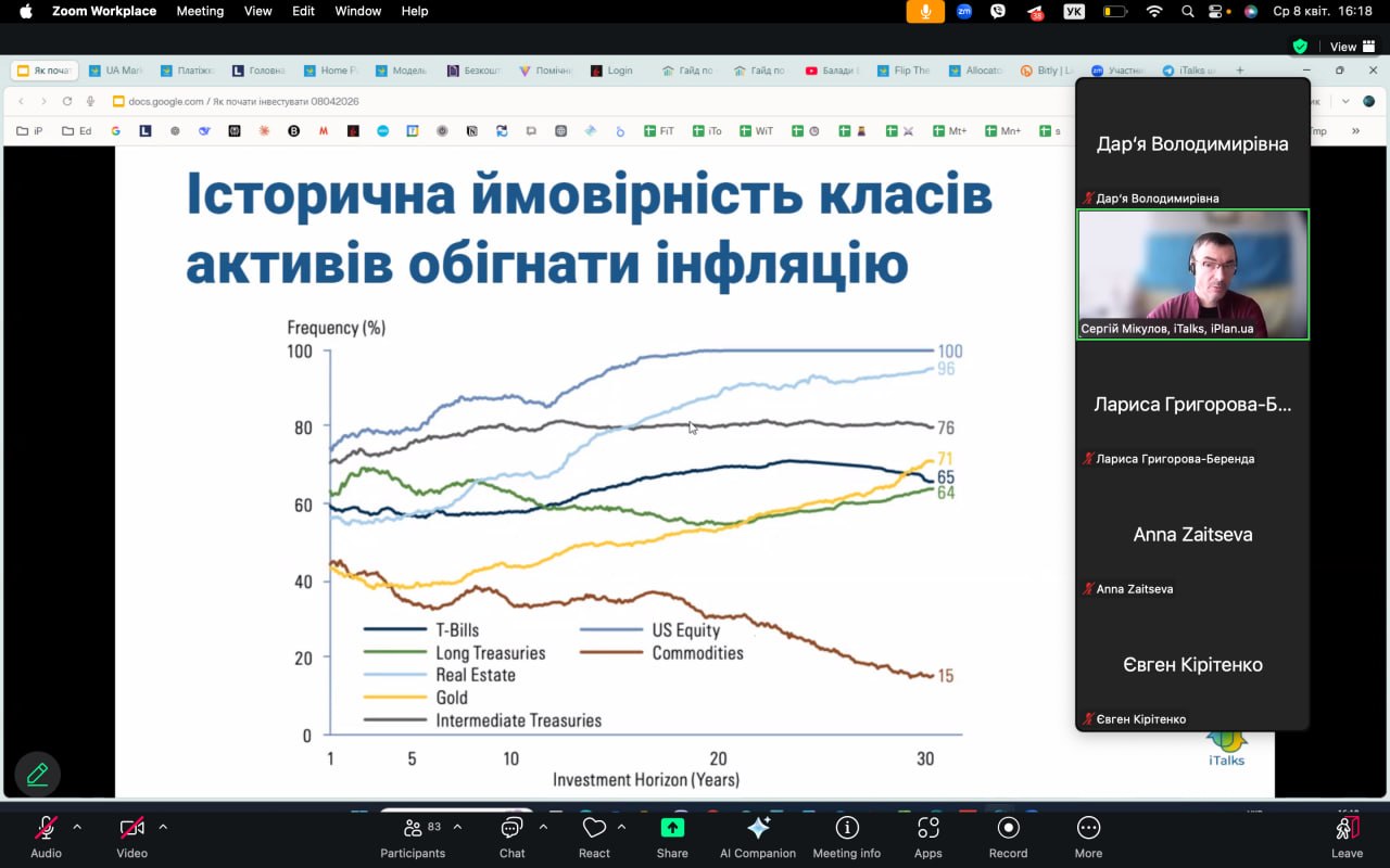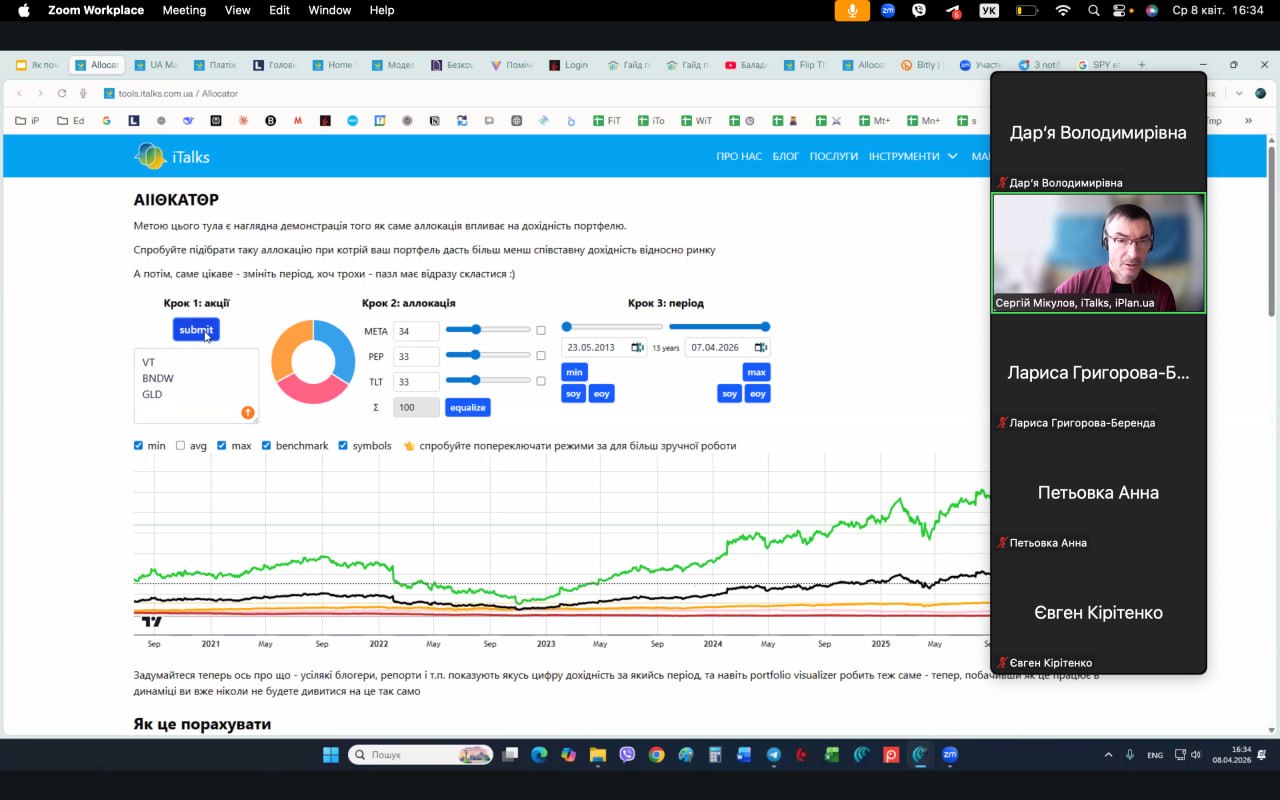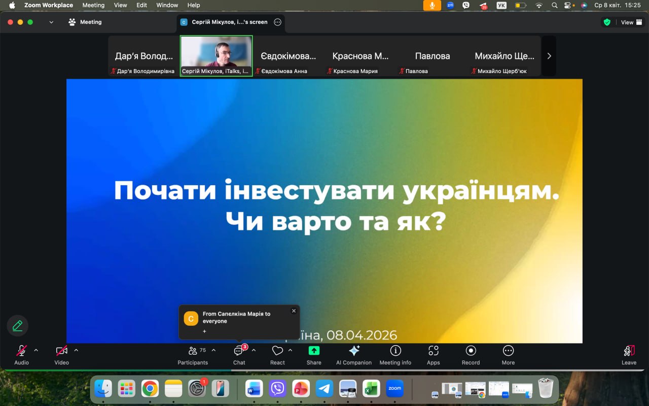 8 квітня 2026 р. в рамках курсу "Основи економіки та фінансова грамотність" студенти групи ГШ-31 разом з старшим викладачем кафедри соціально-економічної географії і регіонознавства імені Костянтина Нємця Венгрин Дарʼєю Володимирівною відвідали онлайн-подію від фінансового експерта Сергія Мікулова на тему "Почати інвестувати українцю. Чи варто та як?"